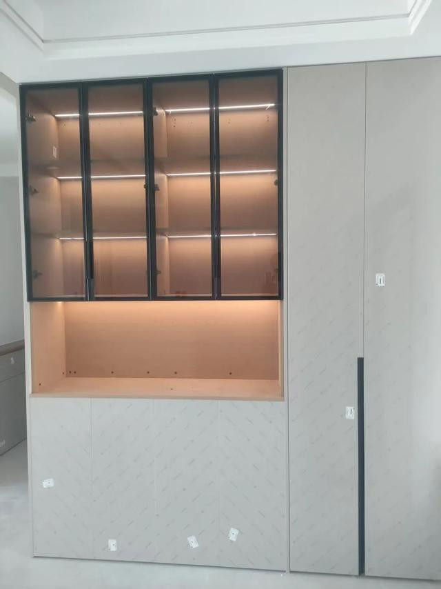 酒柜,下半部分是造型,上半部分盛放酒类展示,玻璃门加灯带,氛围拉满。