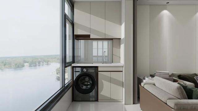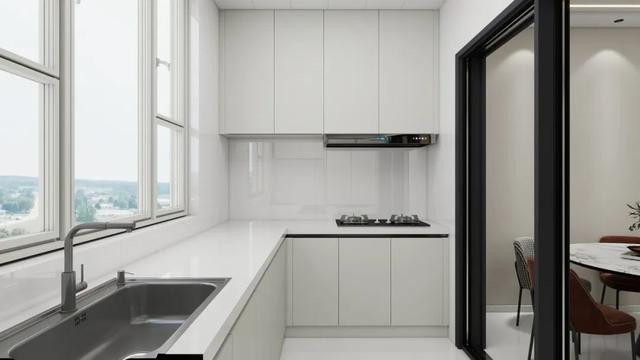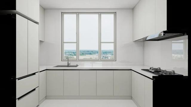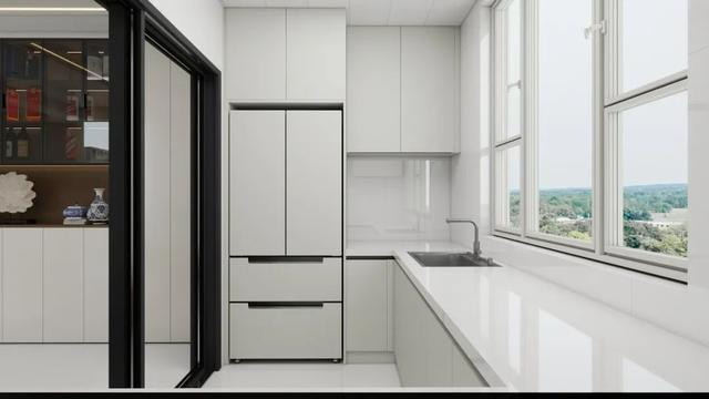 厨房做的浅色PET门板,纯白色大理石台面,内嵌冰箱的冰箱柜。厨房与餐厅客厅相连,做浅色可以使空间更通透干净,更整洁。