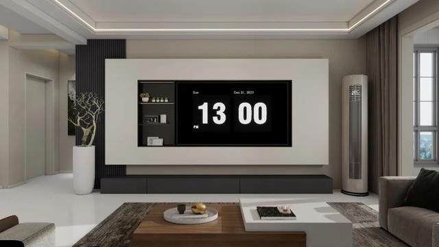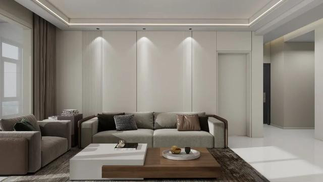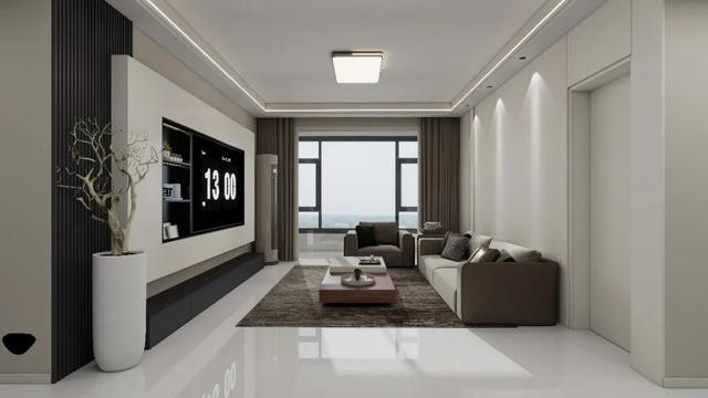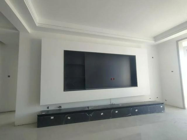 咱们电视墙是做的中心凸出的造型,边框内嵌灯带条,里面镶嵌不锈钢金属壁龛用于悬挂电视机。中心凸起加边框围合的做法,使电视墙成为了整个客厅的吸睛之地,墙面深色格栅加浅色墙板的做法,使空间不至于太单调。