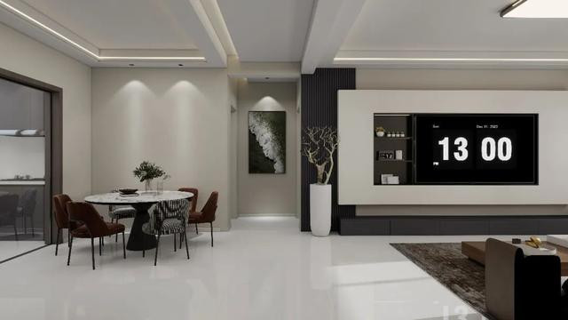 咱们客餐厅做的是传统的边吊加双眼皮加灯带的做法,保留原顶不动,边吊下吊,营造空间延伸感,有增加层高的视觉效果。多层次的石膏板带造型,可以使空间更具备多样性,更丰富。客餐厅造型保持一致,增加完整感。咱们走廊采用的是平顶加反光灯槽的造型。这种比起来传统的双梁夹平顶的造型,更加灵动活泼,也更有氛围感。