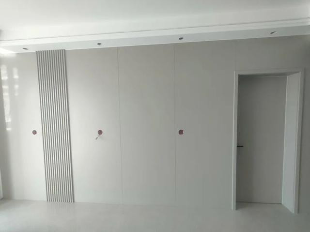 沙发背景墙采用的是和木门同色的实木复合烤漆格栅加墙板。因为客户不喜欢隐形门的做法,所以做了整面墙的墙板,墙板与木门形成一个整体,减少单独门洞带来的割裂感。
